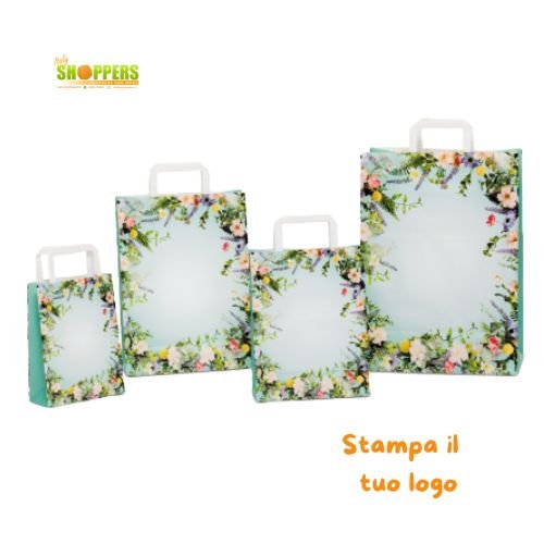 Busta fondo bianco e risvolto colorato maniglia piatta bianca. Il disegno è una fantasia di fiori dalle diverse sfumature di colori. Adatte alla personalizzazione del vostro logo con stampa flessografica, serigrafica, a caldo, monocolore su entrambe i lati