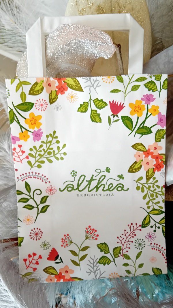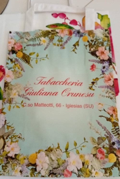 Busta fondo bianco con fantasia floreale e maniglia piatta. Bella da acquistare neutra oppure da personalizzare col tuo logo con stampa flessografica, serigrafica e a caldo monocolore su entrambe i lati.